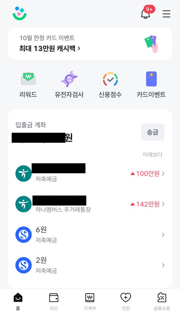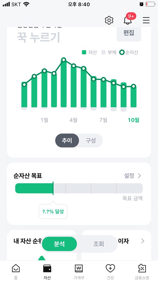 제가 제일 잘 사용하는 부분은 홈화면이랑 가계부에요. 홈화면에서 나의 총 자산을 확인하고, 가계부에서 각 월별로 얼마나 소비했는지 확인합니다. 예산에 비해 얼마나 사용했는지도 한눈에 볼 수 있어요. 그외에 순 자산이 얼마있는지도 확인 할수있습니다. 순자산은 집, 차, 현금 등 모두를 가리켜 책정됩니다. 자산을 관리하다보면 대출을 알아보게 되는데요. 나에게 가장 적합한 대출 상품도 추천해주고 상담 받아 볼 수 있도록 해주고 있습니다. 나아가 건강까지 대비할수있도록 보험 상품도 함께 소개되고, 경각심을 갖게 또래와 비교했을때 위험 수치도 나타내 줍니다. 그런데,, 발병위험률 기준은 잘 모르겠어요.