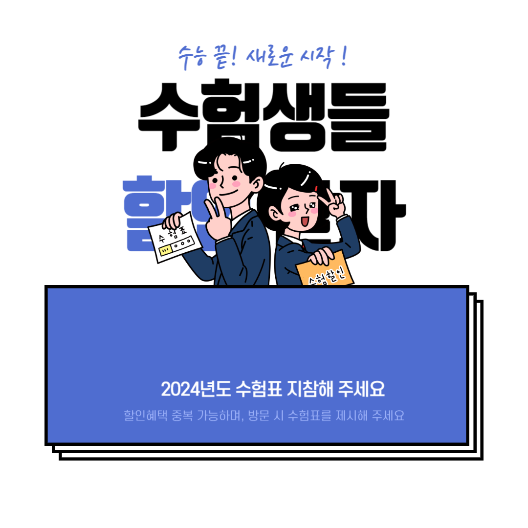 2024년 2월 28일까지 수험생 본인과 동반1인에게 국내선 항공권을 최대 40%할인된 가격으로 제공합니다. 예약시에는 수험표와 신분증을 필수로 지참해야합니다.