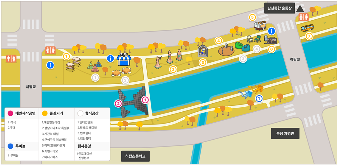 즐길거리로는 판매 및 체험이 이루어지는 예술만능마켓, 성남 예외조각 특별전, 시간의 터널, 소공연장에서 진행하는 특별한 공연, 푸드트럭이 있는 미미라운지, 이웃이 진행하는 성남이야기 ' 시민라디오', 가족이 함께하는 더빙체험 등이 준비되어있습니다. 휴식공간도 빈백, 캠핑, 팔레트 등등 테마별로 준비되어 있어 맛있는 주말에 아이들과 가족들과 혹은 연인과 간식거리를 사들고 산책나오기 너무 좋은 기회인것 같아요! 각 위치별 세부 정보를 보시고싶으시면 아래 '축제세부지도 바로보기'를 클릭하셔서 확인해주세요.