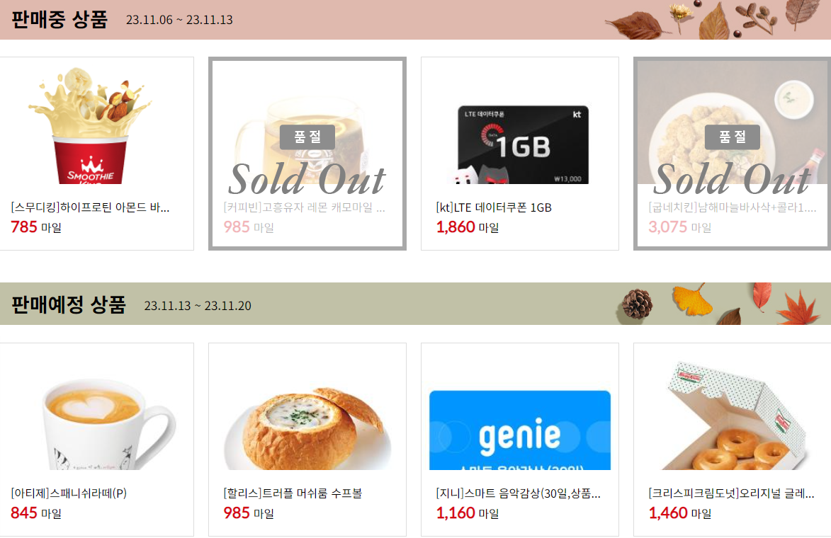 매주 바뀌는 다양한 위클리 딜즈 상품을 구매할 수 있습니다. 스무디팅, 커피빈, 데이터 쿠폰, 아티제 , 지니 음악쿠폰 등을 매주마다 새로운 상품들이 구성되며 모두 마일리지로 구매할 수 있어요.