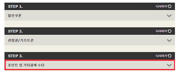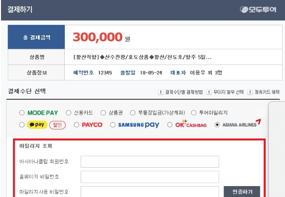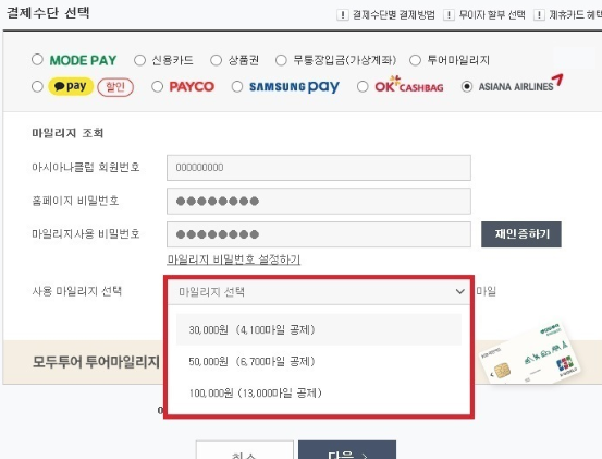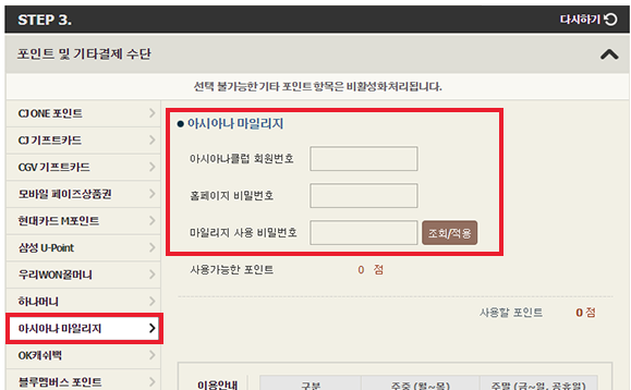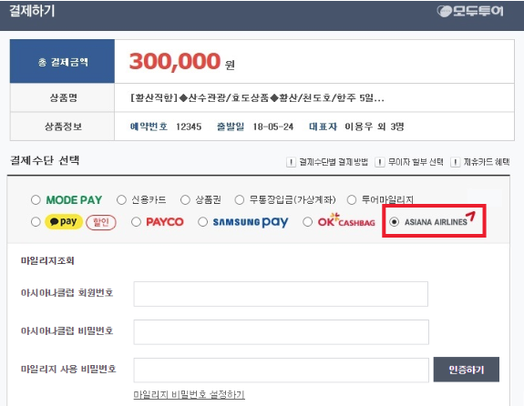 2) 결제 수단 선택하여 ASIANA AIRLINES 선택