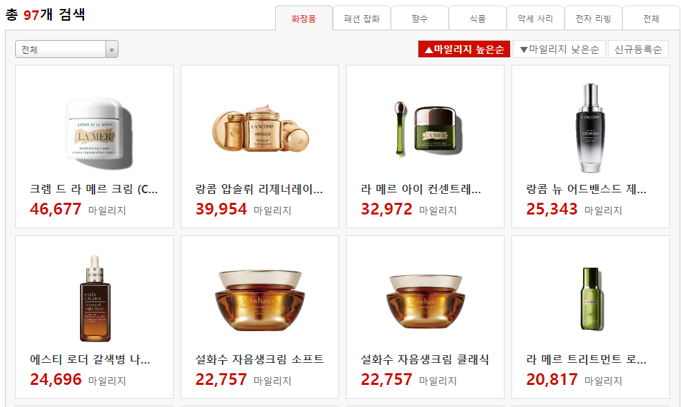 아시아나 항공은 대한한공에 비해 마일리지 몰 상품이 다양하거나 구매할 만한 상품은 없어보입니다. 여행이나 라이프 쪽이 더 강세로 보이네요.