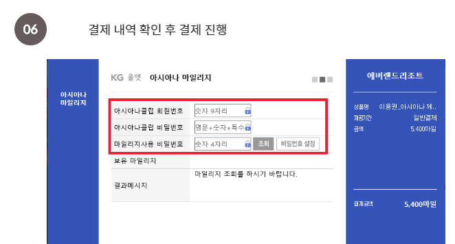 - 마일리지 사용 비밀번호 4자리 입력(마이아시아나 > 회원 정보 > 마일리지 비밀번호 등록 /변경)
