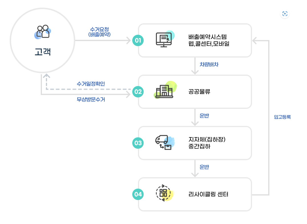폐가전제품 배출 예약은 아래 홈페이지에서 전국 어디서나 간편하게 하실 수 있습니다. 배출예약 시스템은 온라인, 콜센터, 모바일로 가능하며 예약시 차량이 자동배차됩니다. 수거일정을 확인한 후에 방문해서 무상으로 수거해갑니다. 이후 지자체에서 리사이클링 센터로 이동하게됩니다.