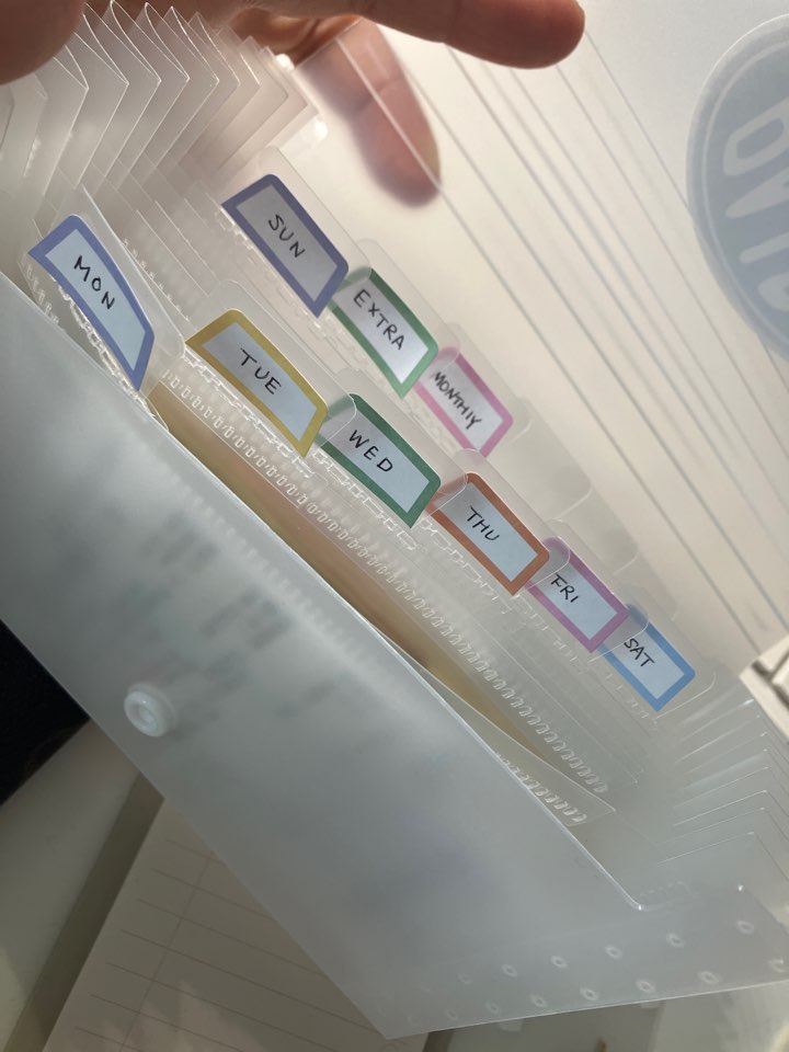 저는 먼저 가장 저렴하면서도 유용할 것 같은 아코디언 파일과 영수증 보관 파일을 45000원 주고 아트박스에서 구매했습니다. 요일별로 예산을 넣어두고, 주간 정산 시 남는 금액은 저축 챌린지에 넣어 저축할 예정입니다.