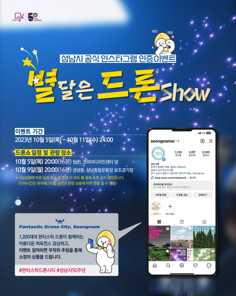 선선한 가을이 왔습니다. 2023년 성남 드론 라이트쇼가 찾아왔어요. 4차산업 특별 도시 성남에서는 시 승격 50주년 기념을 기념하여 1200대의 판타스틱 드론의 퍼포먼스가 펼쳐진다고 합니다.