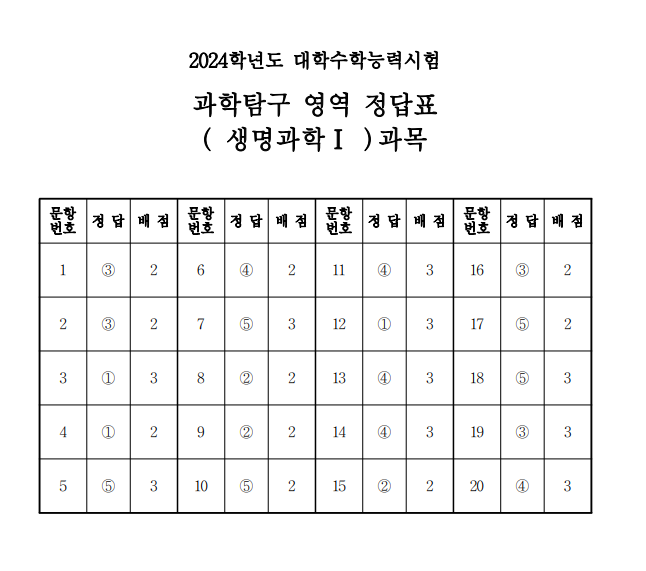 2024 수능 생명과학 1 답안지