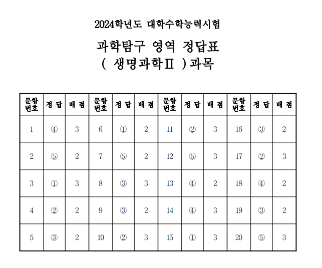 2024 수능 생명과학 2 답안지