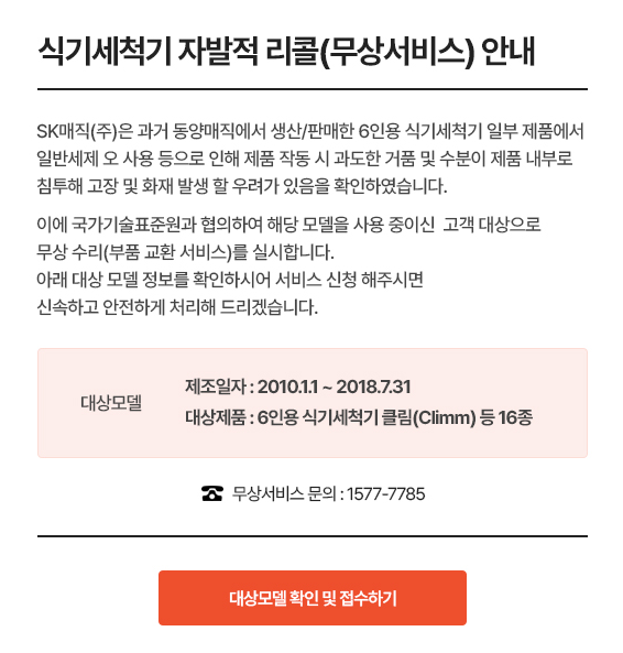SK 매직 6인용 식기세척기 일부 제품에서 고장 및 화재 발생할 우려가 있음을 확인하고 급히 리콜하여 무상으로 AS 서비스를 하는 리콜서비스를 진행하고 있습니다. 식기세척기에 전용 세제가 있는지 모르고 일반 세제를 넣었다가 거품이 엄청 많이 나고 식기세척기는 작동하지 않은적 있지 않으셨나요? 저도 처음 식기세척기를 샀을때 전용 세제가 있는지 모르고 일반 세제를 넣고 돌린 적이 있었는데요. 이러한 오사용으로 인해 SK 매직은 과거 동양매직에서 생산 및 판매한 6인용식기 세척기 일부 제품에서 거품 및 물이 제품 내부로 침투해 고장 및 화재 발생할 수 있음을 확인하여 리콜 서비스를 진행하고 있습니다.