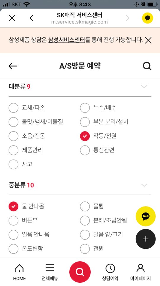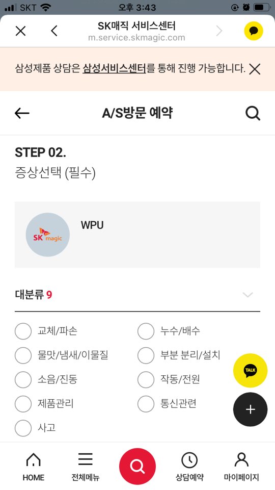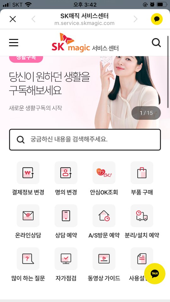 먼저 AS고객센터에 전화를 했고, 카카오톡으로 안내를 눌러서 카카오톡으로 접수하는 것을 선택했더니 너무나 빨리 신청하고 해결되었습니다. 통화연결만 기다리면서 저처럼 고생하고 고치는걸 미루고 계시는 분들이 있을까 해서 포스팅해보아요. SK 매직 식기세척기, 정수기, 냉장고 등 뭐든 전화로 말고 홈페이지에서 접수하세요. 그러면 바로 당일에 전화오고 전화로 해결할 수 있는 일들을 방법을 알려주어 해결해주고요. 필터교체나 장비파손 등 방문이 필요한 것은 AS 예약을 잡아주더라구요.